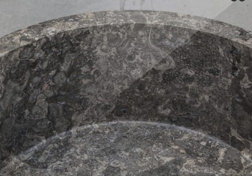 Lavandino free standing in marmo composto da grande catino levigato e base cilindrica lavorata su materiale grezzo. Predisposto per collegamenti idraulici. Ogni pezzo è unico.