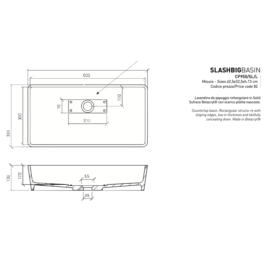 Lavandino Slash Big Basin CP950/SL/L di Cipì in Solid Surface rettangolare