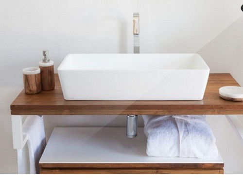 Lavandino Slashbig di Cipì da appoggio rettangolare in Solid Surface Betacryl con scarico piletta nascosto.