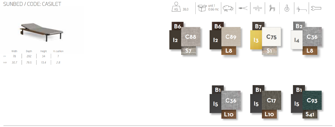 Il lettino da giardino Casilda è reclinabile e con le ruote. La semplicità delle linee mette in risalto la mensola opzionale in legno iroko o stonewood che si può aggiungere sul laterale del lettino. La combinazione di più elementi con mensola induce a percepire una fusione di forme elegantemente collegate dal piano in legno. La struttura è in acciaio inox verniciato a polvere. La seduta è supportata da cinghie elastiche sintetiche specifiche per l’esterno. La cuscineria è sfoderabile, facile da lavare e resistente agli agenti atmosferici. Imbottitura in quick dry foam.