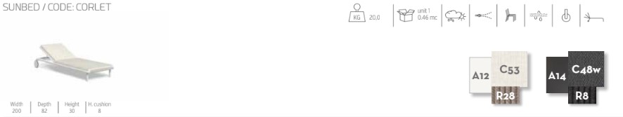 Il lettino da sole Coral propone un contrasto giocoso di volumi, mettendo in relazione i ‘vuoti’ delle linee ariose e leggere della struttura in alluminio, ai ‘pieni’ della cuscinatura solida e generosa. L’impugnatura frontale rivestita di corde sintetiche abbinate al colore della struttura caratterizza il prodotto, le due tonalità in cui è possibile declinare il Lettino ne fanno un elemento distintivo per un Living outdoor elegante e raffinato.