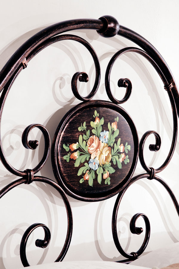 Letto matrimoniale Emmy in ferro battuto. Letto che richiama lo stile classico. Interamente in ferro battuto lavorato a mano artigianalmente. Caratterizzato dal medaglione sulla testata con dipinta una rosa a mano. Disponibile in diverse versioni e in numerose colorazioni a scelta. SU RICHIESTA E' POSSIBILE PREVENTIVARE IL LETTO IN DIMENSIONI FUORI MISURA
