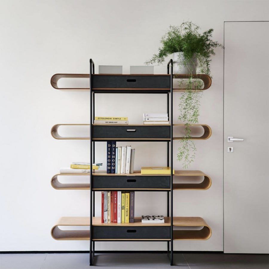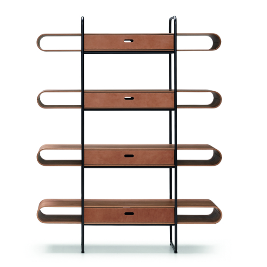 Libreria a parete Apelle con struttura in metallo e ripiani in legno. Optional: cassetti in cuoio.