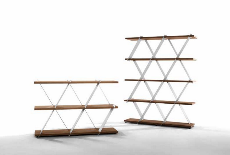 Libreria a parete Castle di Tonin Casa è una libreria con struttura in metallo e piani rivestiti in legno. Una struttura leggera ed essenziale, che fonda la sua forza sugli spazi aperti, su triangoli di luce che invadono la presenza di metallo e legno. Come un castello di carte. Castle si riempie grazie ai colori, ai giochi di luce che ciascuna delle sue finiture è in grado di creare, e si modella a piacere, che sia posizionata in verticale o in orizzontale. Un magnifico gioco di design.