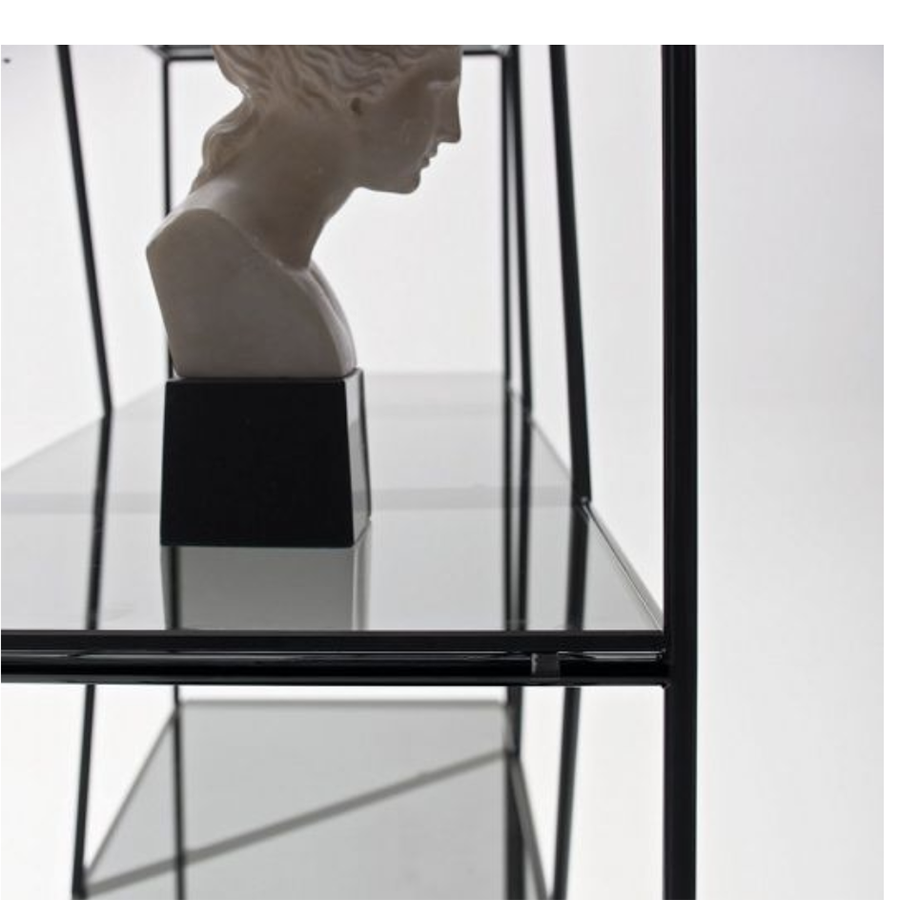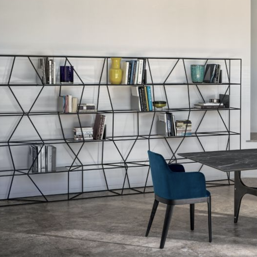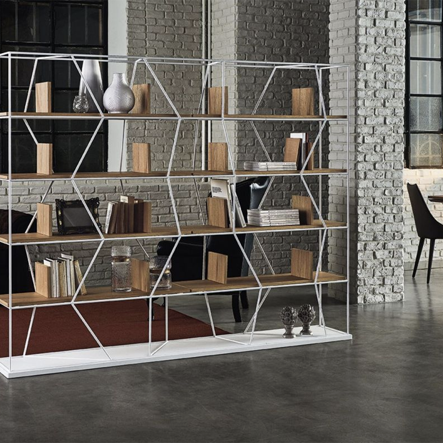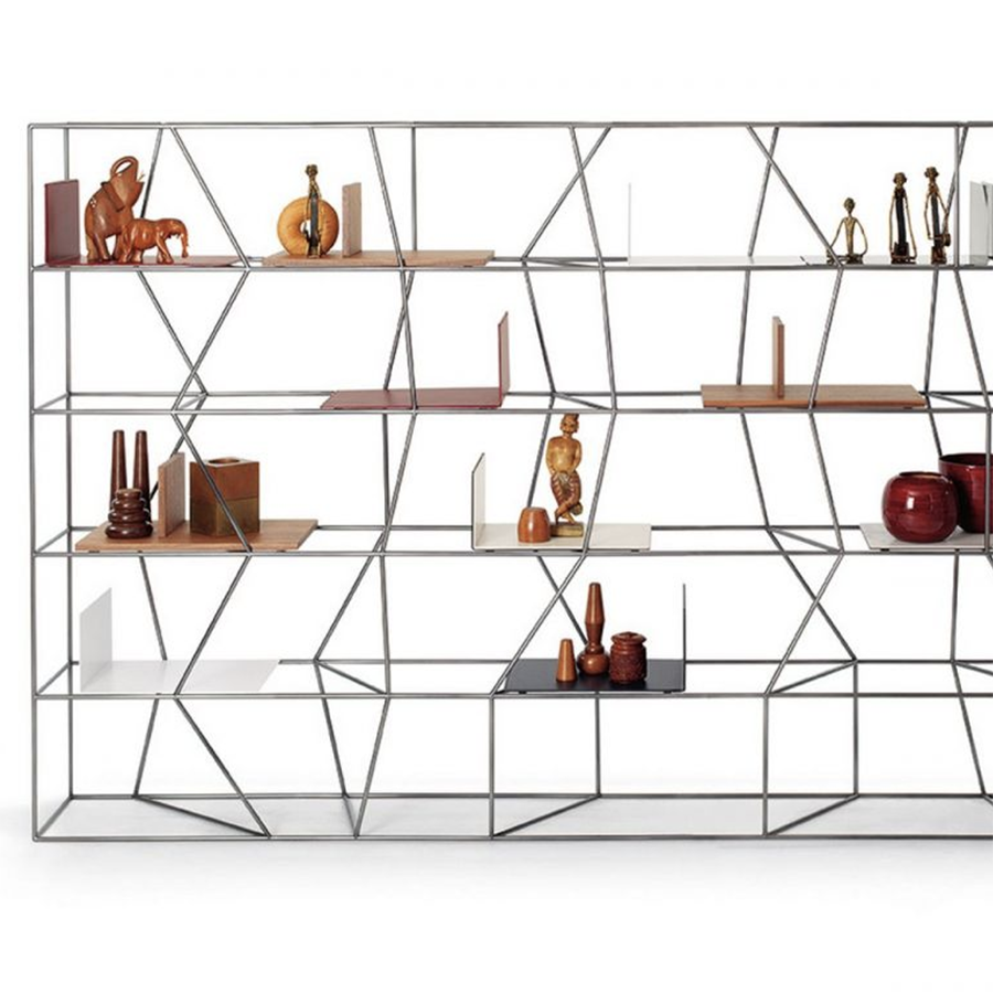 Libreria Lexington di Bontempi con struttura in acciaio laccato componibile disponibile sia da muro sia con base in legno laccato, per struttura free standing e ripiani per libreria in acciaio laccato, acciaio laccato accoppiato con SuperCeramica o SuperMarmo, in acciaio rivestito in cuoio, in legno impiallacciato o in cristallo.