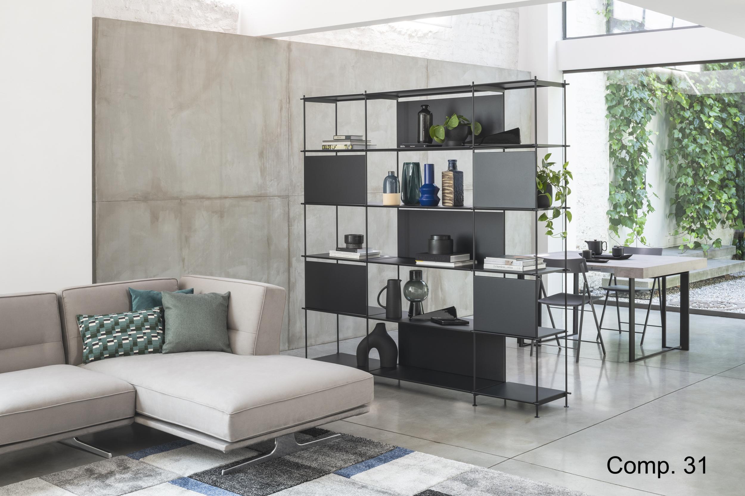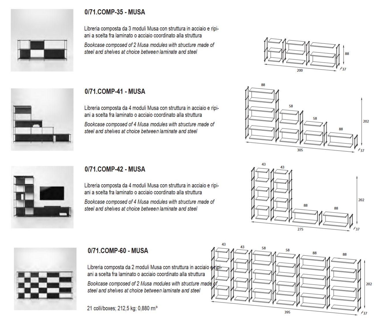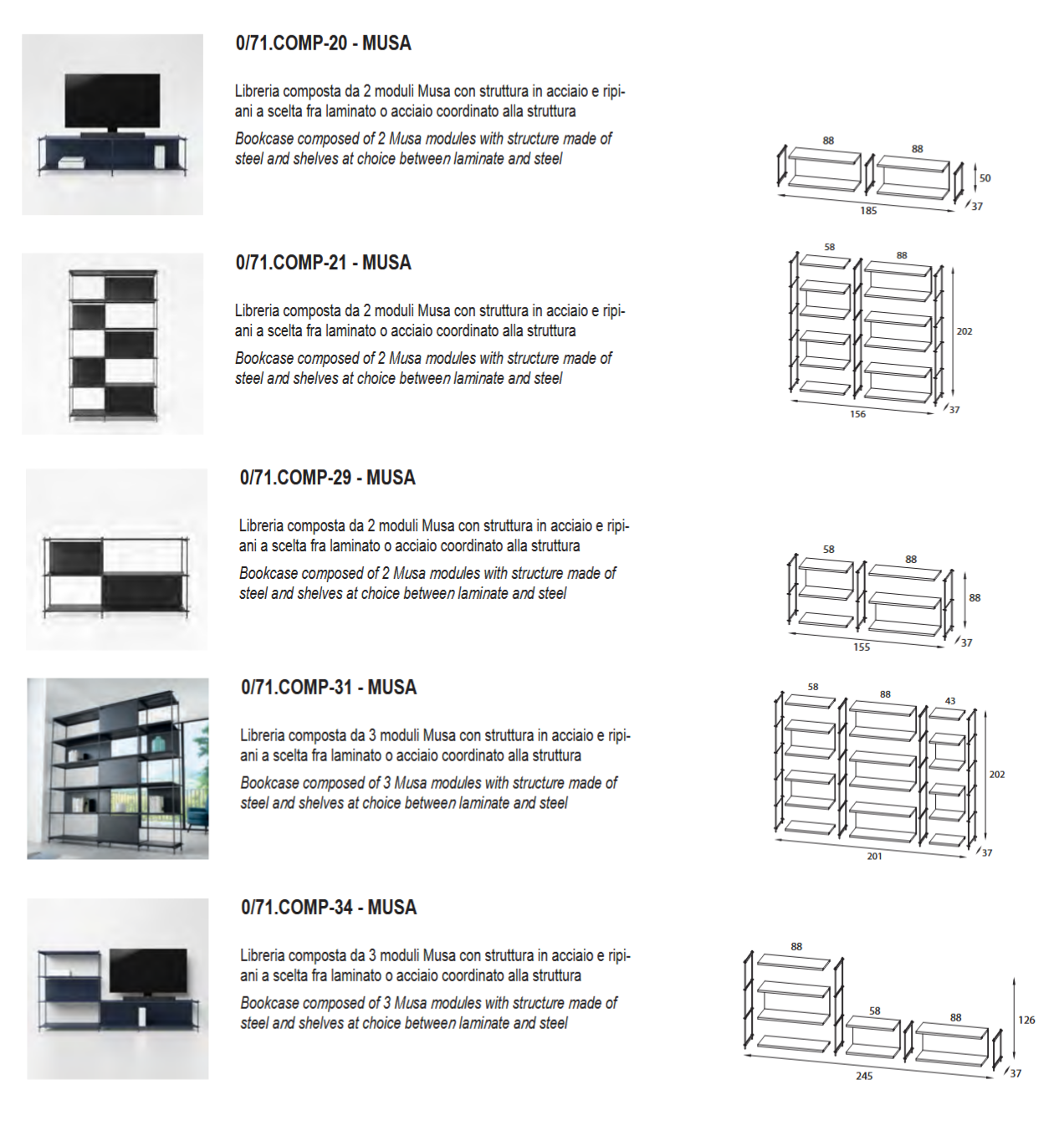MUSA è la libreria componibile ideale per chi ama il design e lo stile minimalista. La libreria è molto versatile e si presta ad essere utilizzata a parete oppure al centro della stanza come divisorio. La struttura modulare di MUSA è interamente realizzata in acciaio con fianchi portanti in tondo pieno Ø12 mm e schiene in lamina di acciaio, entrambi verniciati con sofisticate finiture sablé. Il sistema permette di creare le composizioni più adatte alle vostre esigenze combinando tra loro fianchi di 4 altezze diverse (cm 202, 126, 88 e 50) e ripiani disponibili in varie dimensioni: cm 43, 58, 88. I ripiani solo inoltre disponibili in diversi materiali. In acciaio verniciato nelle stesse finiture sablé della struttura oppure in laminati ecologici da 12 mm dalle finiture effetto satinato o materici. I piedini in acciaio sono registrabili in altezza per poter compensare eventuali irregolarità nel pavimento.