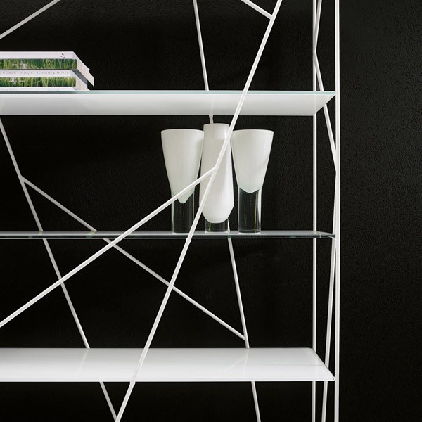 Libreria Naviglio di Tonin Casa realizzata con intreccio di fili metallici verniciati che sostengono dei ripiani in vetro o in legno. Naviglio è un insieme di linee, geometriche e precise, secche e regolari, che formano un particolare mosaico di spazi interrotti. Il metallo verniciato si fonde con i ripiani in vetro o in legno, e raggiunge un perfetto equilibro di spazi e forme.