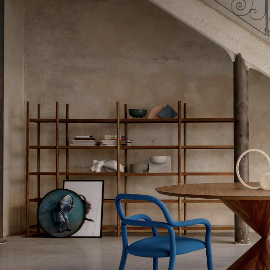 Libreria modulabile Siena con struttura in legno e ripiani in vetro o metallo.