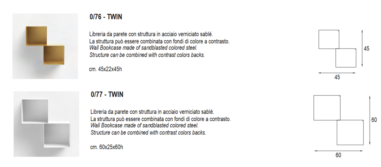 Libreria componibile, dove i classici cubi sono rivisitati in chiave moderna grazie all'accoppiamento dal motivo leggermente asimmetrico che li caratterizza. Realizzata in acciaio verniciato con finitura sablé. Disponibile anche nella misura più grande (cm 60x60, art. 0/77) per poter creare spettacolari composizioni giocando con la disposizione, le differenti profondità e l'abbinamento dei colori: la strtuttura può essere combinata con fondi di colore a contrasto.