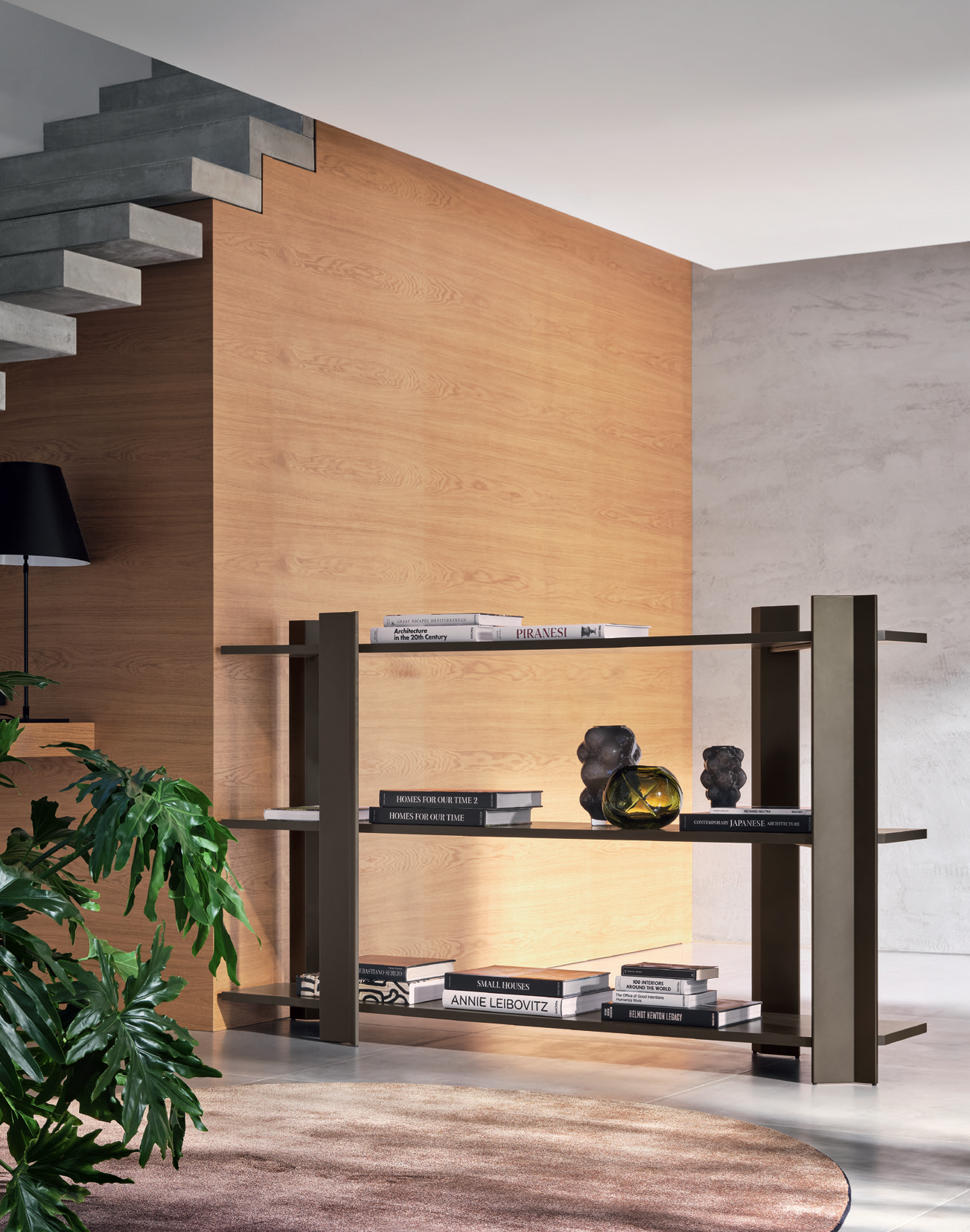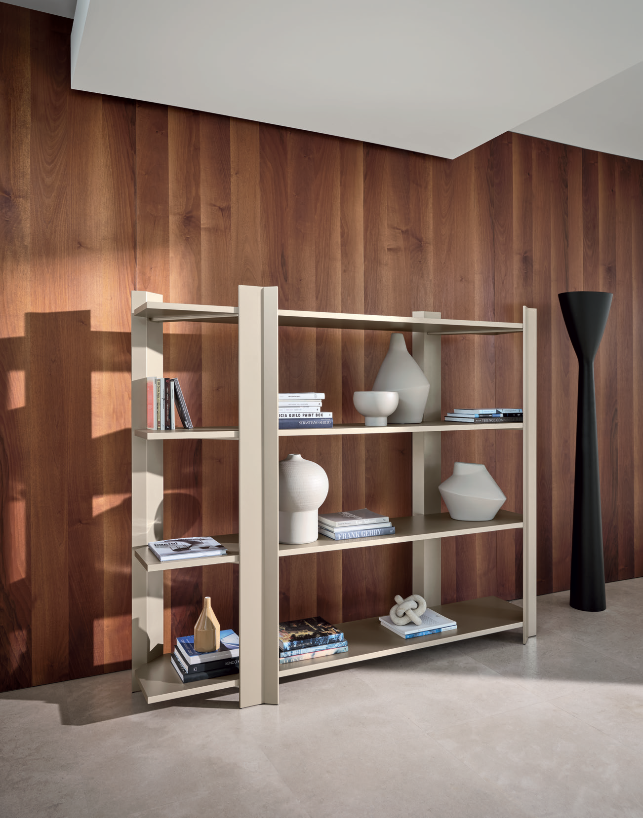LIBRERIA A GIORNO CON FIANCHI IN METALLO E RIPIANI LACCATI