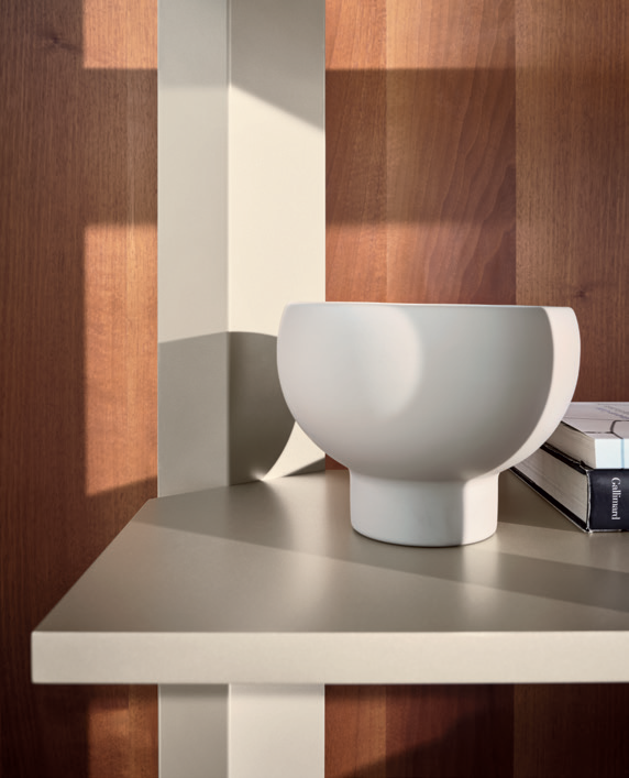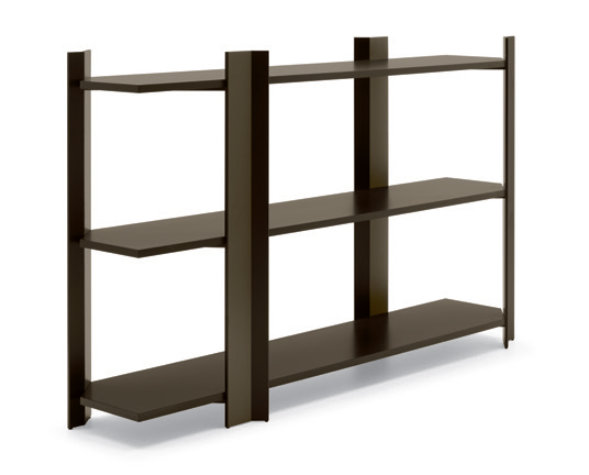 Wu è una libreria freestanding, un arredo versatile da utilizzare sia a parete sia a centro stanza come elemento divisorio. Il design è essenziale, ma è caratterizzato da alcuni dettagli come i sostegni a forma di V posizionati in modo irregolare e le mensole con angolo tagliato, che creano un maggiore dinamismo visivo.