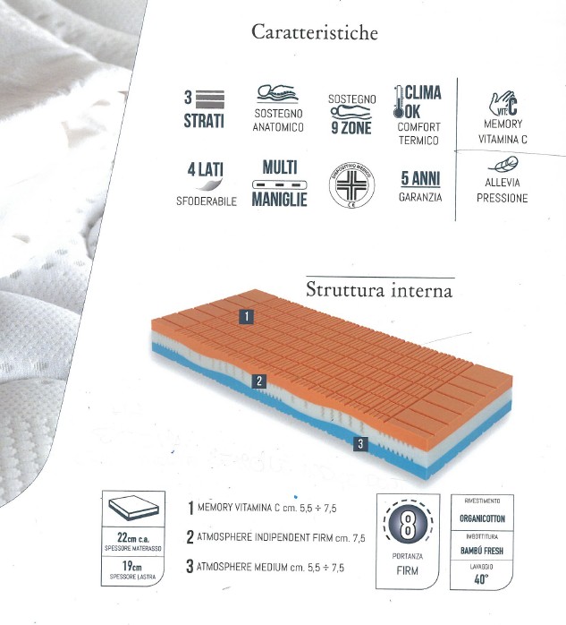 Memory Vitamina C: il memory vitamina C garantisce un sonno rigenerante. Coniuga al meglio le caratteristiche di traspirabilità, confort, durata ed elasticità del memory con i benefici delle materie prima a base di Vitamina C. Quest' ultima è conoscita per le sue importanti caratteristiche antiossidanti ed in è in grado di contrastare l'azione dei radicali liberi.