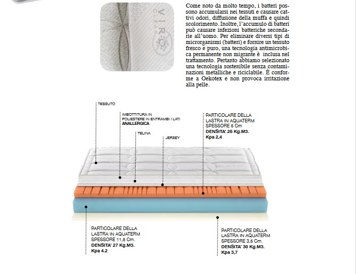 Dalla fusione di acqua e aria con polimeri innovativi e di tecnologia avanzata nasce Aquaterm, uno dei più avanzati materiali per le strutture interne dei materassi. Aquaterm è un prodotto di una elasticità unica nel suo genere. La struttura molecolare a celle aperte comunicanti, permette la libera circolazione dell'aria. La continua circolazione dell'aria tra gli spazi delle cellule assicura un totale microclima che diventa indispensabile per un perfetto riposo, con una deumidificazione costante e controllata. Aquaterm ci ha permesso di realizzare materassi ergonomici che si modellano intorno al nostro corpo in maniera graduale e differenziata.