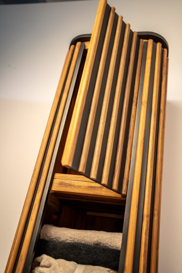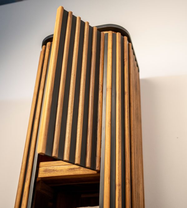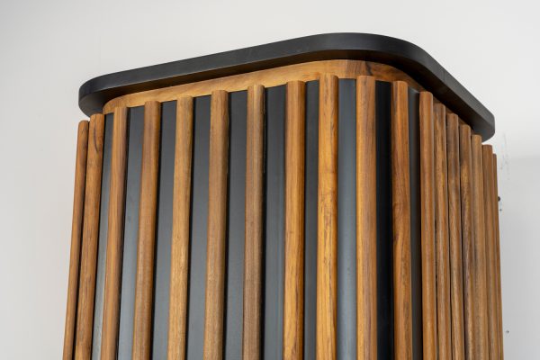 Di certo non può passare inosservato per le dimensioni, ma ancor di più per lo stile inconfondibile. Realizzato in teak massello e mogano Invilla Cabinet è immediatamente riconoscibile dagli inserti a bacchetta in teak naturale che disegnano la superficie nero notte e dalle forme curve prive di spigoli o maniglie.