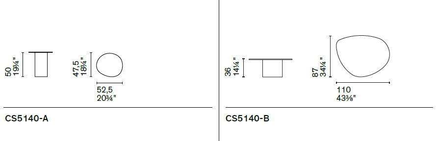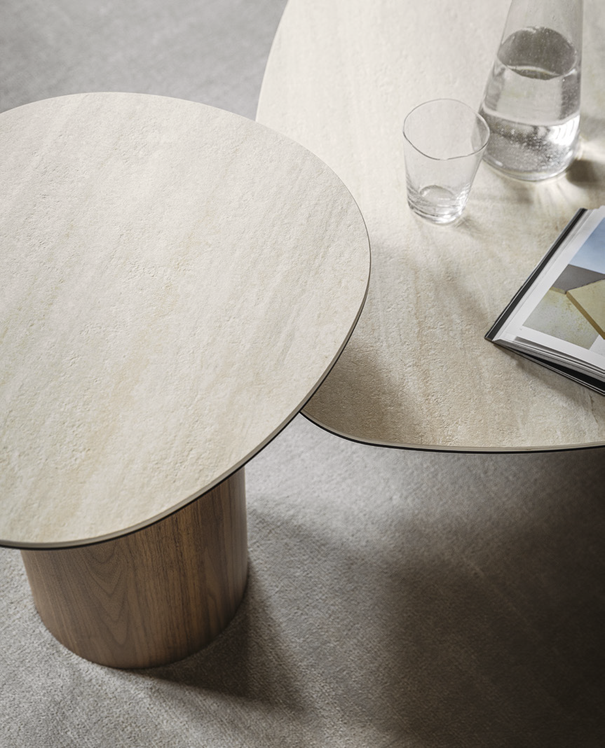 Si ispira a forme organiche la collezione Mushroom, che per la semplicità dell’abbinamento tra una base generosa e un piano dalle linee irregolari ricorda un fungo. È disponibile in due dimensioni, anche da combinare tra loro: la più alta affianca poltrone e divani, mentre la più bassa, con il piano più ampio, è ideale al centro del salotto.