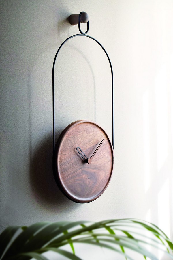 Orologio Eslabòn di Nomon ispirato al design dei gioielli, dove l'asta curva tiene la lastra di marmo o di noce naturale, dando al prodotto una sottile leggerezza. Mani in legno di noce e lucidato finitura in ottone o nera.