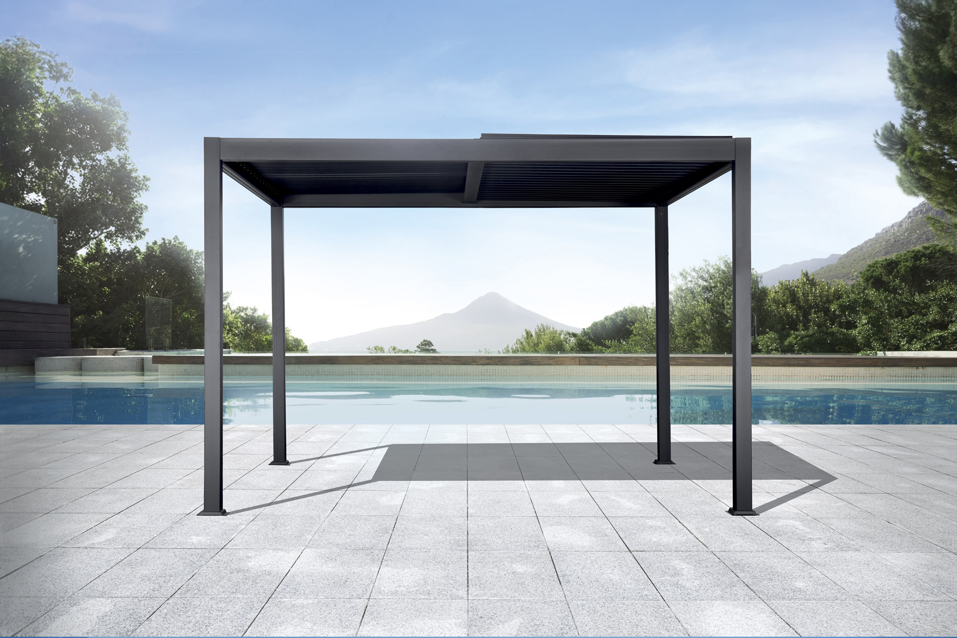 Valorizza il tuo spazio esterno con la Pergola Texas 4x4 in alluminio antracite. Il tetto lamellare orientabile ti permette di regolare luce e ombra, creando un’area elegante e funzionale per relax o momenti conviviali.