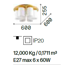 Plafoniera DAISY PL6 di Ideal Lux con base in metallo rifinita con foglia oro. Diffusori in vetro soffiato bianco, acidato e con rigatura in rilievo. Lampadine escluse.