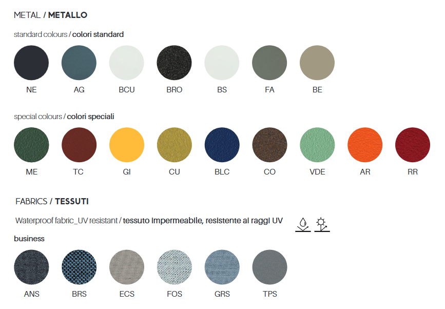 La verniciatura dei metalli è effettuata con polveri termoindurenti poliestere Qualicoat classe 1 e classe 2. Possibilità di trattamento aggiuntivo prima della finitura con applicazione fondo espossidico.