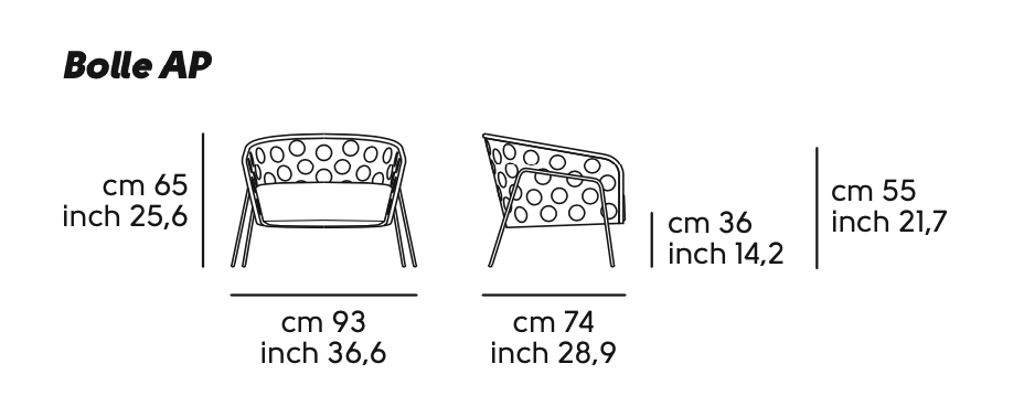 Poltrona lounge con base a quattro gambe, struttura e schienale in metallo verniciato. Cuscini rivestiti in tessuto, pelle o similpelle. É possibile configurare la poltrona bolle scegliendo colori diversi per gambe e schienale. Bolle è disponibile anche in versione outdoor.