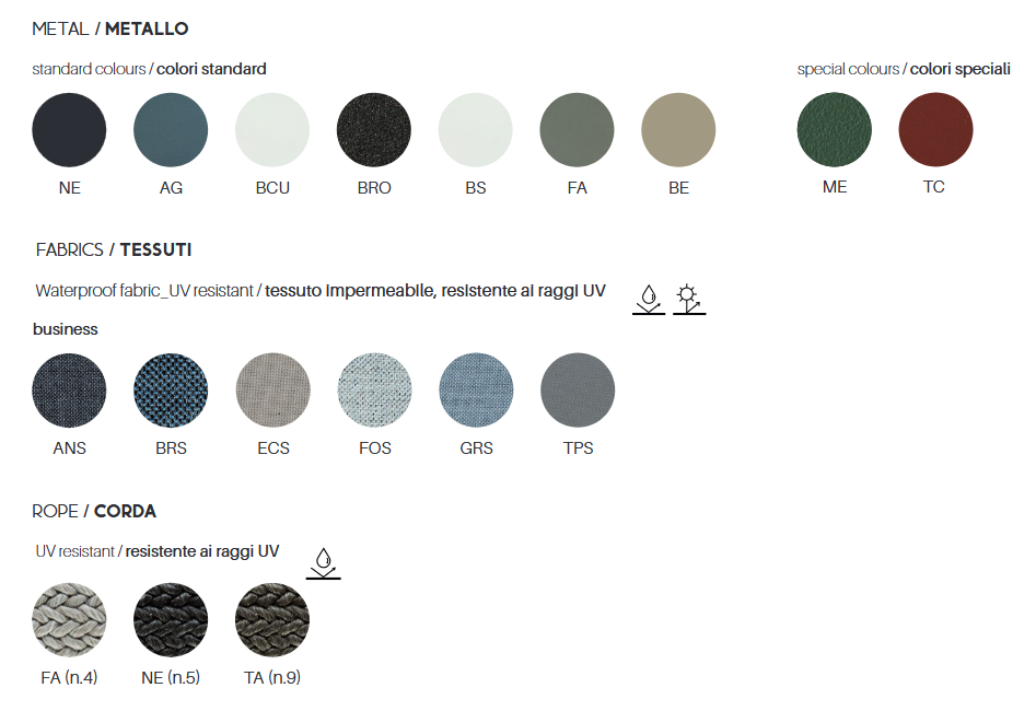 Composizione: 65% Olyna Outdoor, 35% Poliestere Antibatterica, antimuffa, riciclabile, antiallergica, lavabile a 30°, resistente al cloro, resistente ai raggi solari.