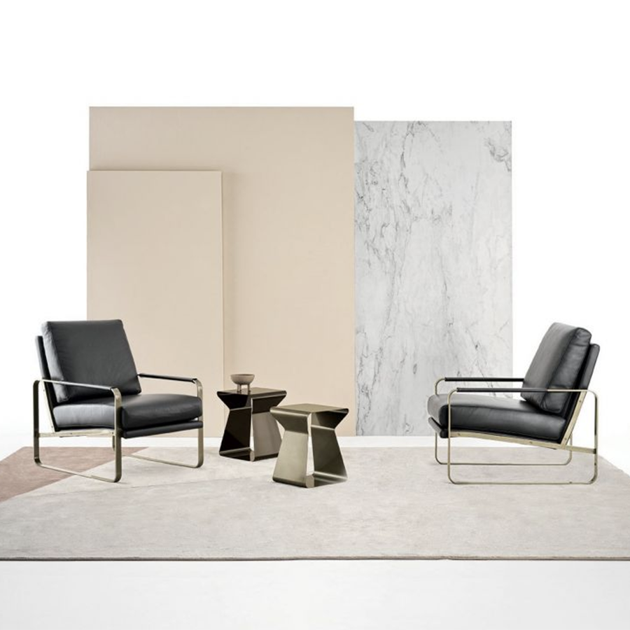 Clarissa è una poltrona caratterizza da un design moderno, elegante e lineare. La struttura completamente è in acciaio laccato. La seduta è composta da due cuscinoni, imbottiti e rivestiti in ecopelle, pelle o tessuto