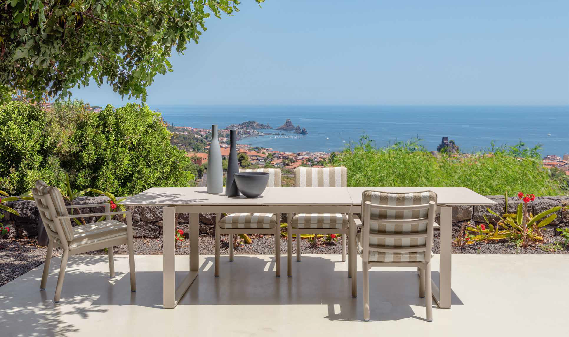 La Poltrona Pranzo unisce leggerezza visiva e comfort contemporaneo in un design essenziale ma raffinato. La struttura in alluminio verniciato accoglie una seduta e uno schienale imbottiti, rivestiti in tessuto tecnico per garantire resistenza e facilità di manutenzione anche in ambienti outdoor. Le linee geometriche e i braccioli sottili disegnano una forma elegante e armoniosa, perfetta per completare tavoli da pranzo in terrazze, verande e spazi contract con uno stile sobrio e senza tempo.