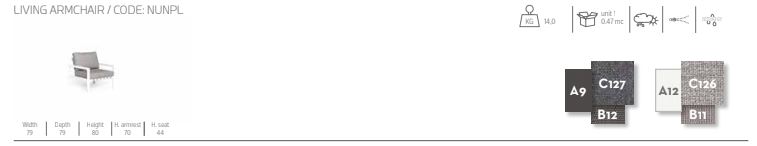 La poltrona living della collezione Nunù di Talenti è caratterizzata da cinghie elastiche sintetiche che supportano seduta e schienale, una struttura in alluminio verniciato, cuscini sfoderabili in tessuto con imbottitura in quick dry foam.