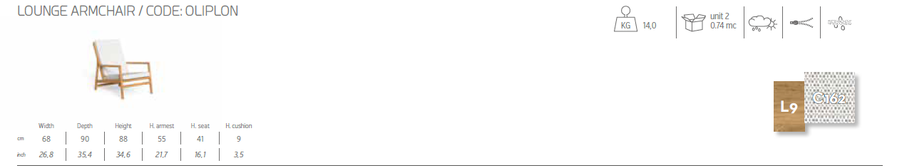 • cm: L. 68 x P. 90 x H. 88 x H.  braccioli 55 x H. seduta 41 x H. cuscino 9