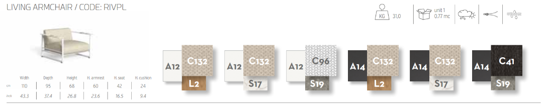 La Poltrona Living Riviera con la sua seduta profonda e abbondante è l’ideale per accogliere il corpo in un momento di relax. La struttura in alluminio, elegante e leggera, lascia spazio ai volumi abbondanti della cuscinatura, valorizzati dalla texture corposa dei filati selezionati. I braccioli in gres sublimano il prodotto aggiungendo un tocco ancor più raffinato all’insieme, facendo di questo complemento d’arredo l’elemento perfetto per valorizzare il proprio spazio outdoor.