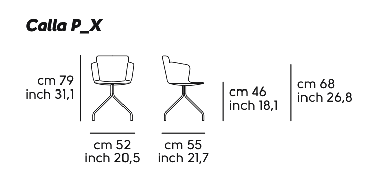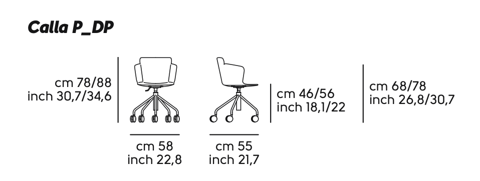 Calla sedia con base a trespolo su quattro gambe in acciaio o con ruote. Seduta in polipropilene o imbottita in tessuto o pelle