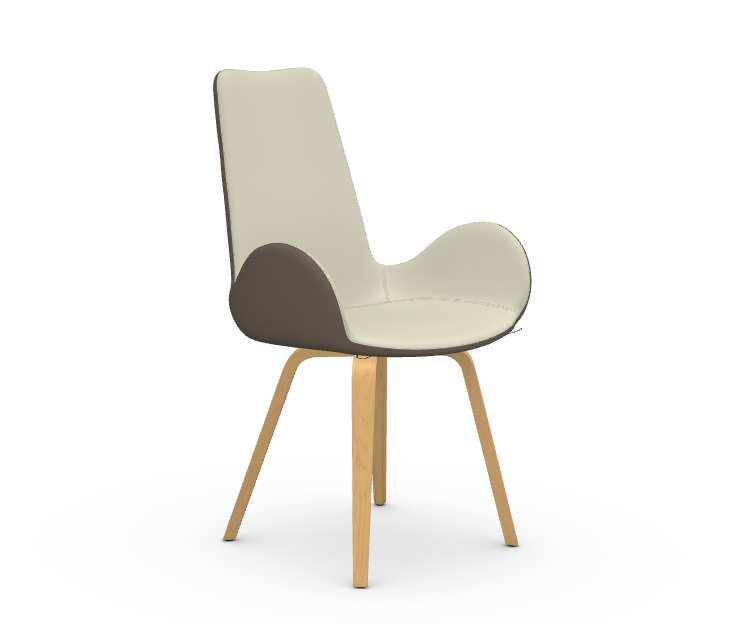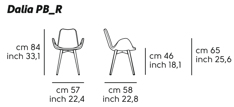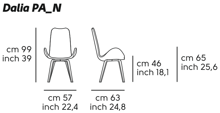 Poltroncina Dalia  con base in legno Frassino o impiallaciato e scocca imbottita. Possibilità di scelta tra schienale alto o basso.