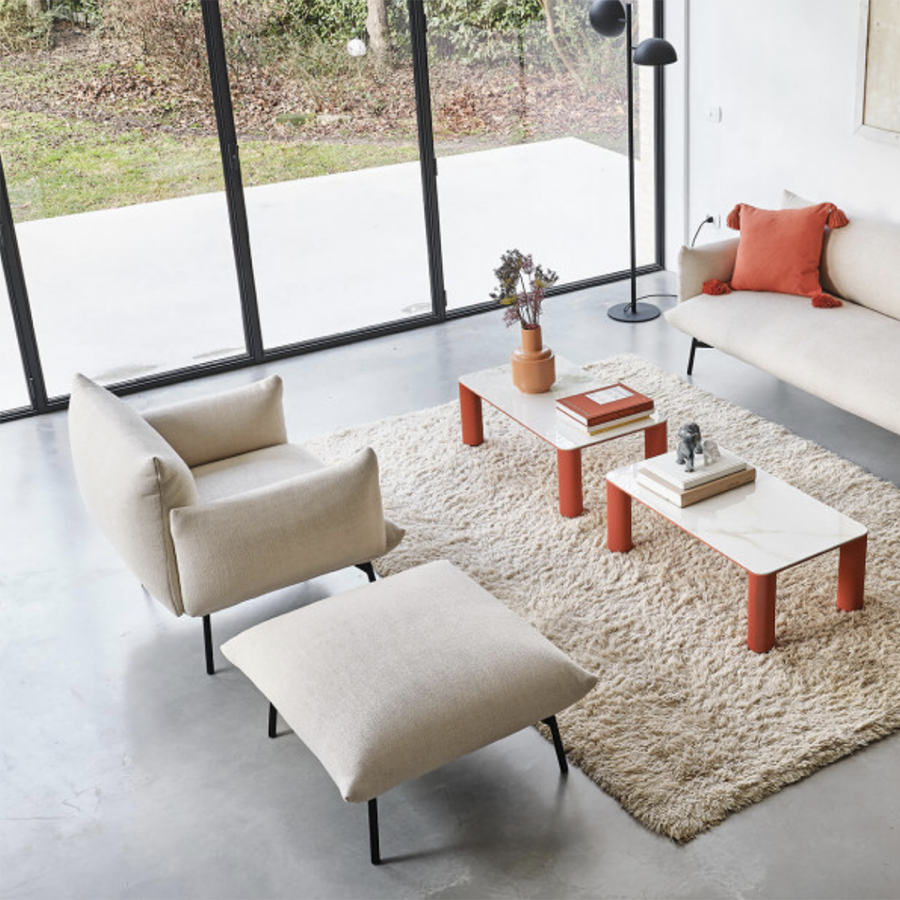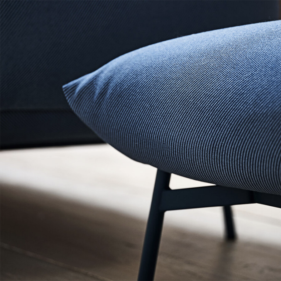 Pouf con quattro gambe in metallo verniciato. Cuscino rivestito in tessuto. Il pouf Area è disponibile anche nella versione singola o a due posti .