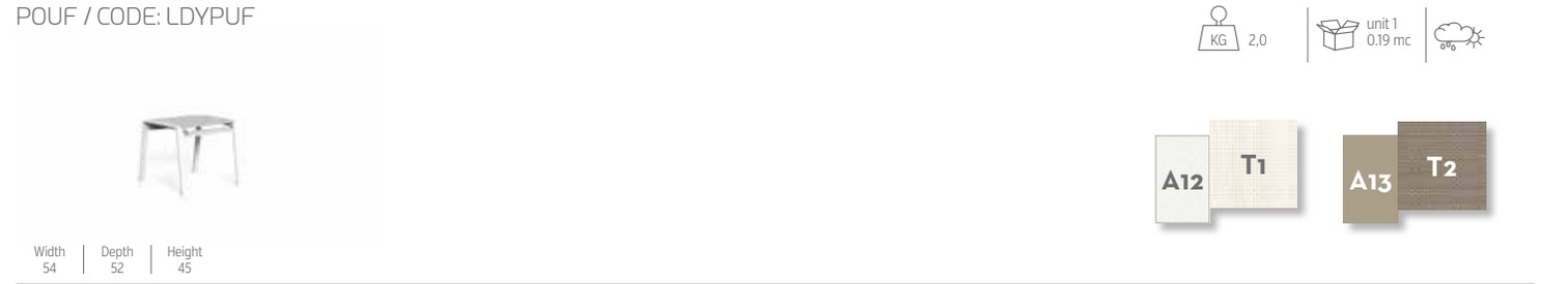 Dalla robusta struttura in alluminio e dal comodo appoggio realizzato in textilene, il Pouf della collezione Lady è un perfetto completamento di un outdoor moderno ed elegante. La forma squadrata del prodotto è in linea con la concezione della collezione, permettendo una massima utilizzabilità assieme agli altri prodotti Lady.