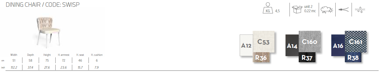 •  cm: L. 51 x P. 58 x H. 75 x HS. 46 x H. cuscino 6
