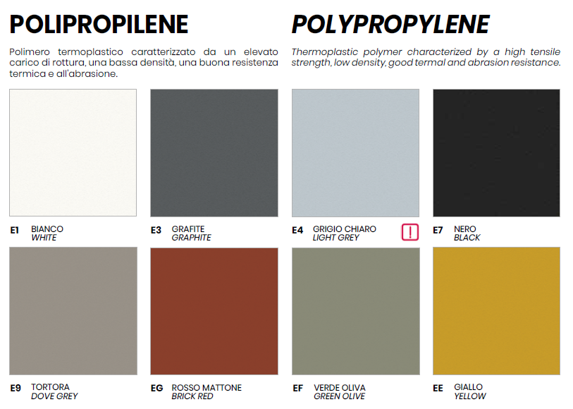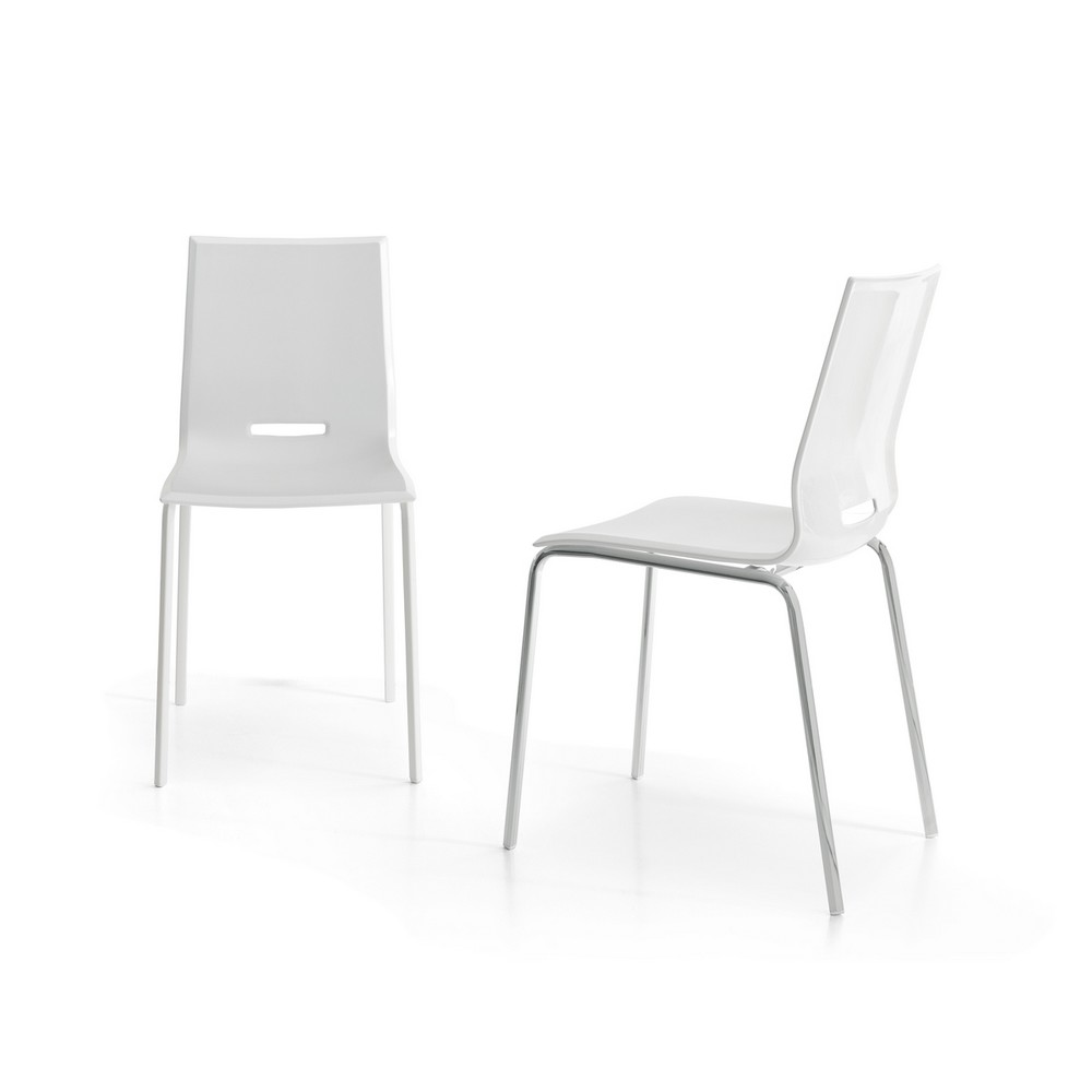 Sedia con struttura in metallo verniciato a sezione triangolare, seduta in polipropilene rinforzato con fibra di vetro con bordo bisellato lucido. Elena dalle linee semplici si adatta in ogni tipo di ambiente domestico o lavorativo come bar o ristoranti.