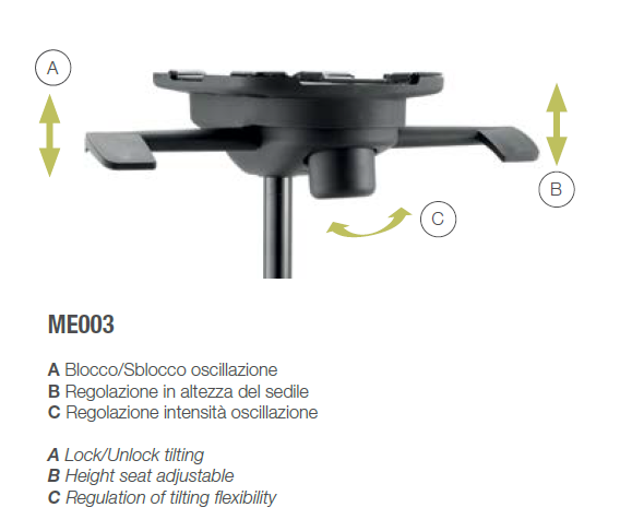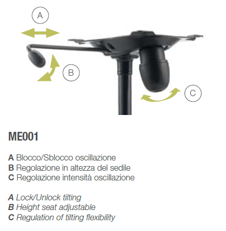 a) Meccanismo oscillante a fulcro avanzato bi-leva in acciaio stampato, 4 posizioni di blocco, sistema di sicurezza antishock dello schienale e regolazione della tensione della molla per la taratura dell’oscillazione tramite pomolo.