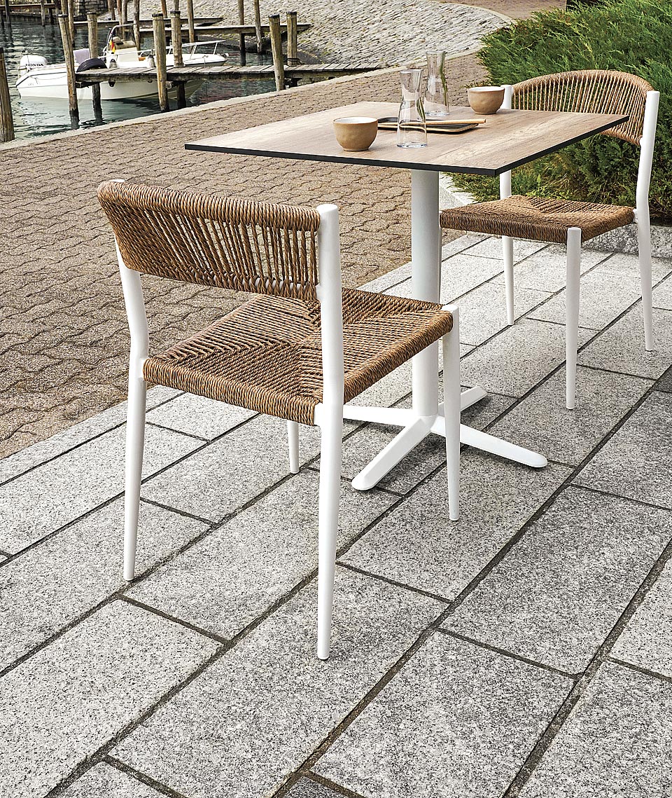 La sedia Milano Contract senza braccioli combina design luminoso e materiali resistenti. La struttura in alluminio bianco con seduta e schienale in wicker paglia offre comfort, leggerezza e praticità. Ideale per bar, ristoranti e spazi outdoor eleganti.