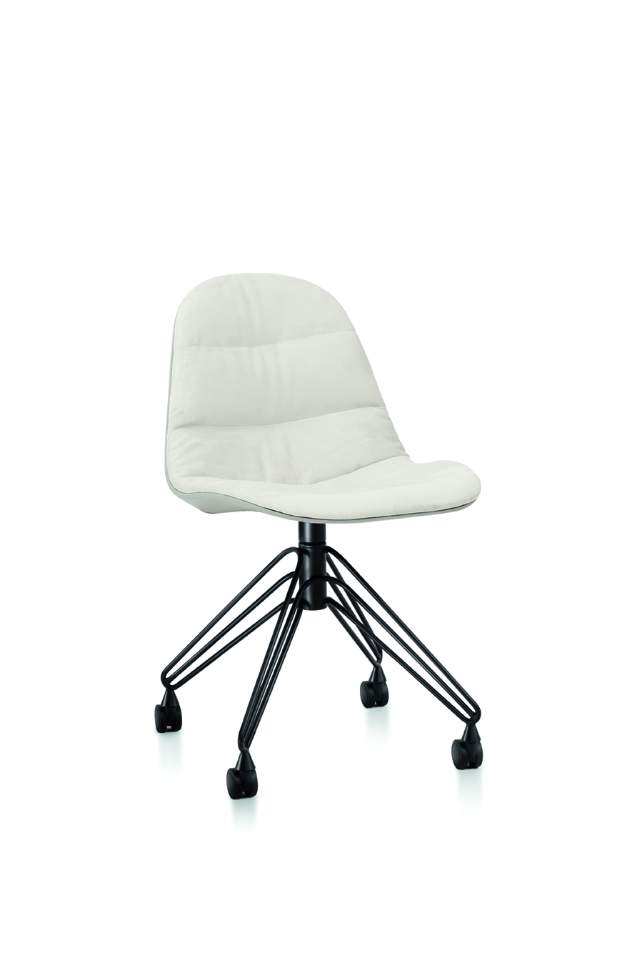 Sedia Mood di Bontempi girevole con e senza braccioli,  con struttura in acciaio laccato, monoscocca in polipropilene rivestita nella parte frontale in varie finiture. Disponibile anche la versione con ruote nere.