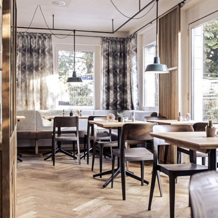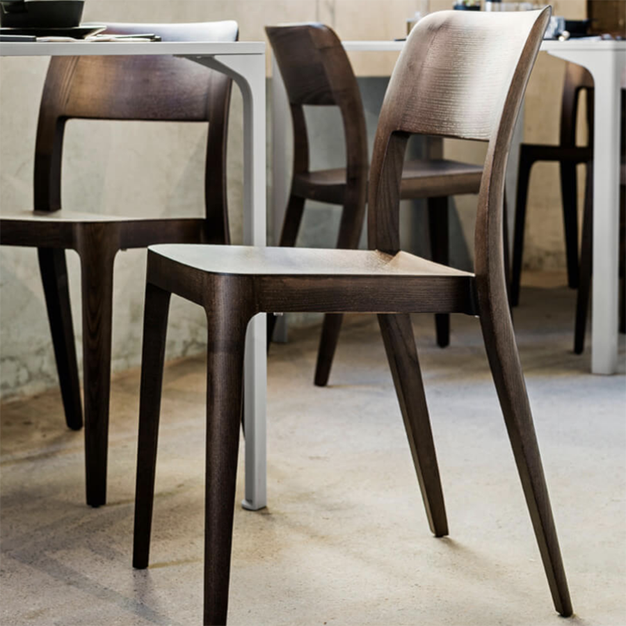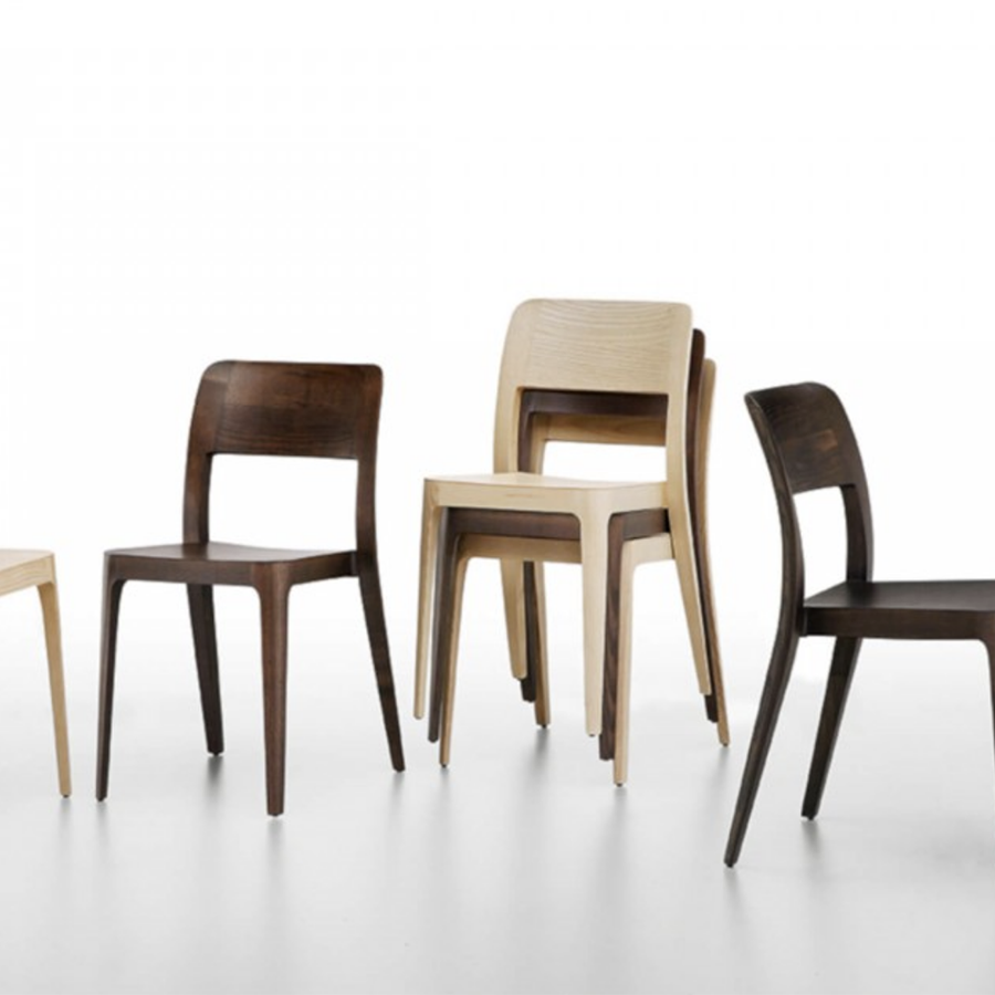 La sedia Nenè con base a quattro gambe in legno è impilabile fino a otto unità.