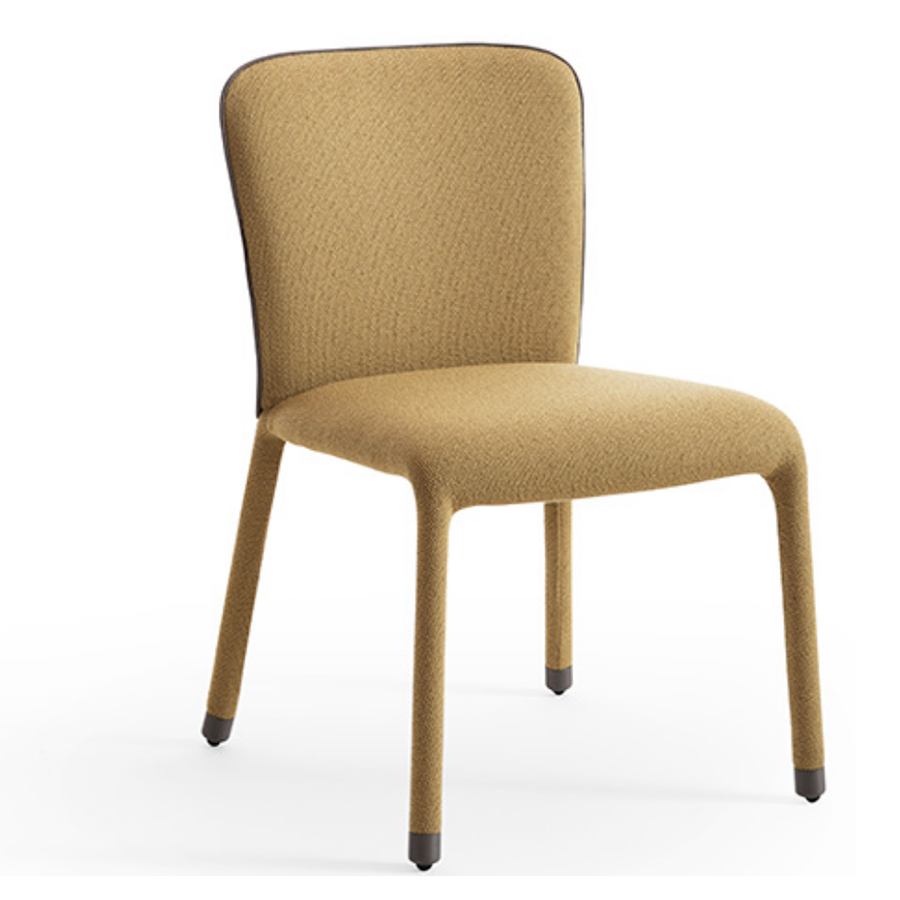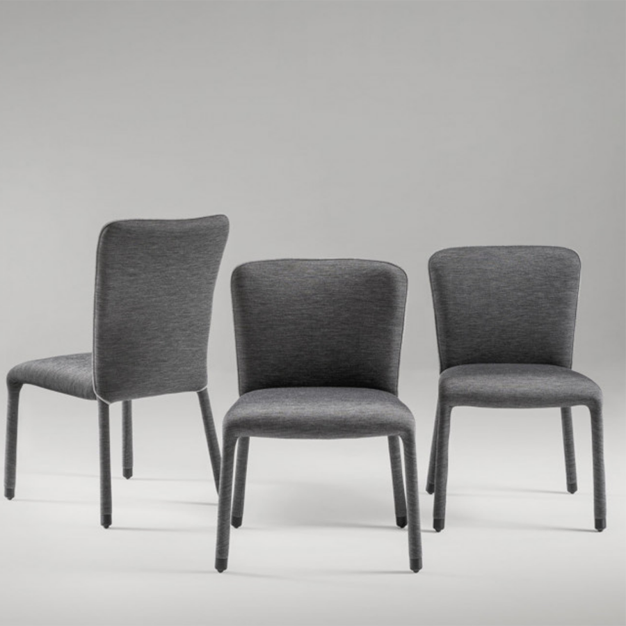 Leggera e dinamica, è contraddistinta da un tratto continuo ed armonioso, che unisce elegantemente tutte le sue parti. Curve sinuosamente definite connotano l’intero design. Lo schienale ha una forma delicatamente avvolgente, che si allarga nella parte superiore, per offrire adeguato sostegno alla schiena e alle spalle. La seduta, anche questa ergonomica, si incurva in avanti per raccordarsi dolcemente con le gambe, evitando spigoli ed angoli netti. Un vezzo estetico, e un particolare connotante, è la cucitura esterna del rivestimento dello schienale. Il piping segue il profilo superiore della scocca e corre lateralmente fino ad abbracciare la gamba, aggiungendole un tocco sofisticato.