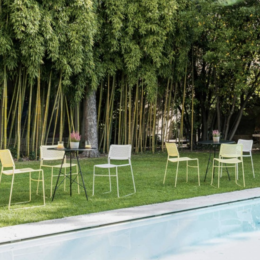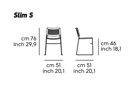 La sedia Slim con base a slitta in acciaio è disponibile per uso interno ed esterno.