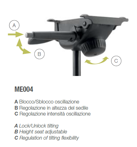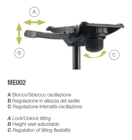 a) Meccanismo oscillante a fulcro avanzato monoleva, in acciaio stampato, 7 posizioni di blocco, funzionamento a pulsante, sistema di sicurezza antishock dello schienale e regolazione della tensione della molla per la taratura dell’oscillazione tramite pomolo.