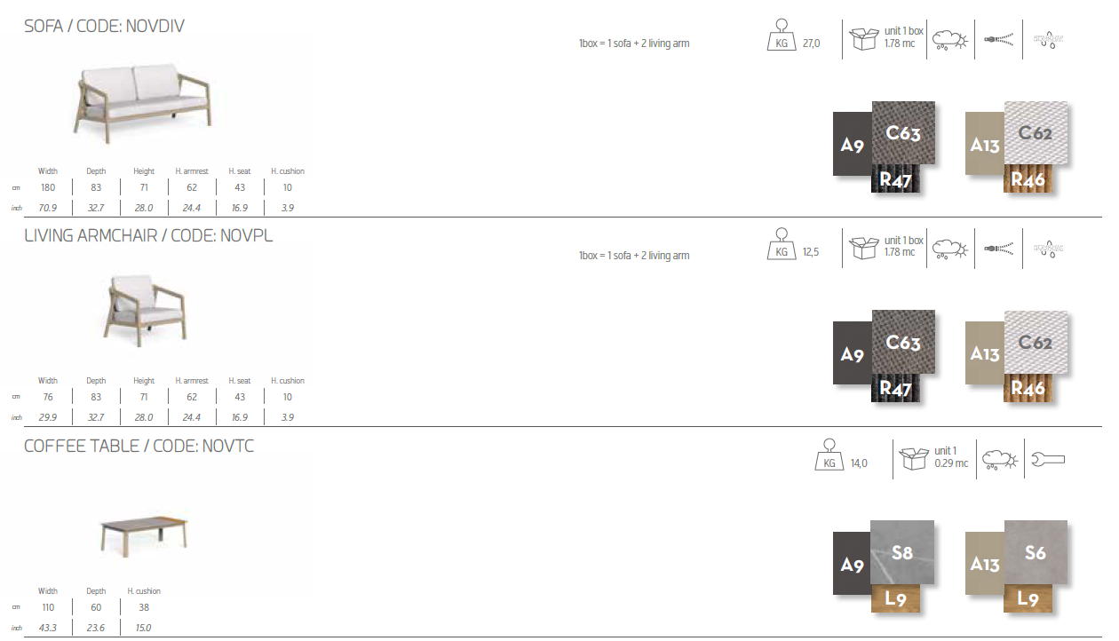 • Alluminio verniciato CARBONE /  Fibra intrecciata GRIGIO / Tessuto cuscini CARBON / Top in NATURAL TEAK /  Top in gres GRIGIO - A9 / R47 / C63 / L9 / S8
