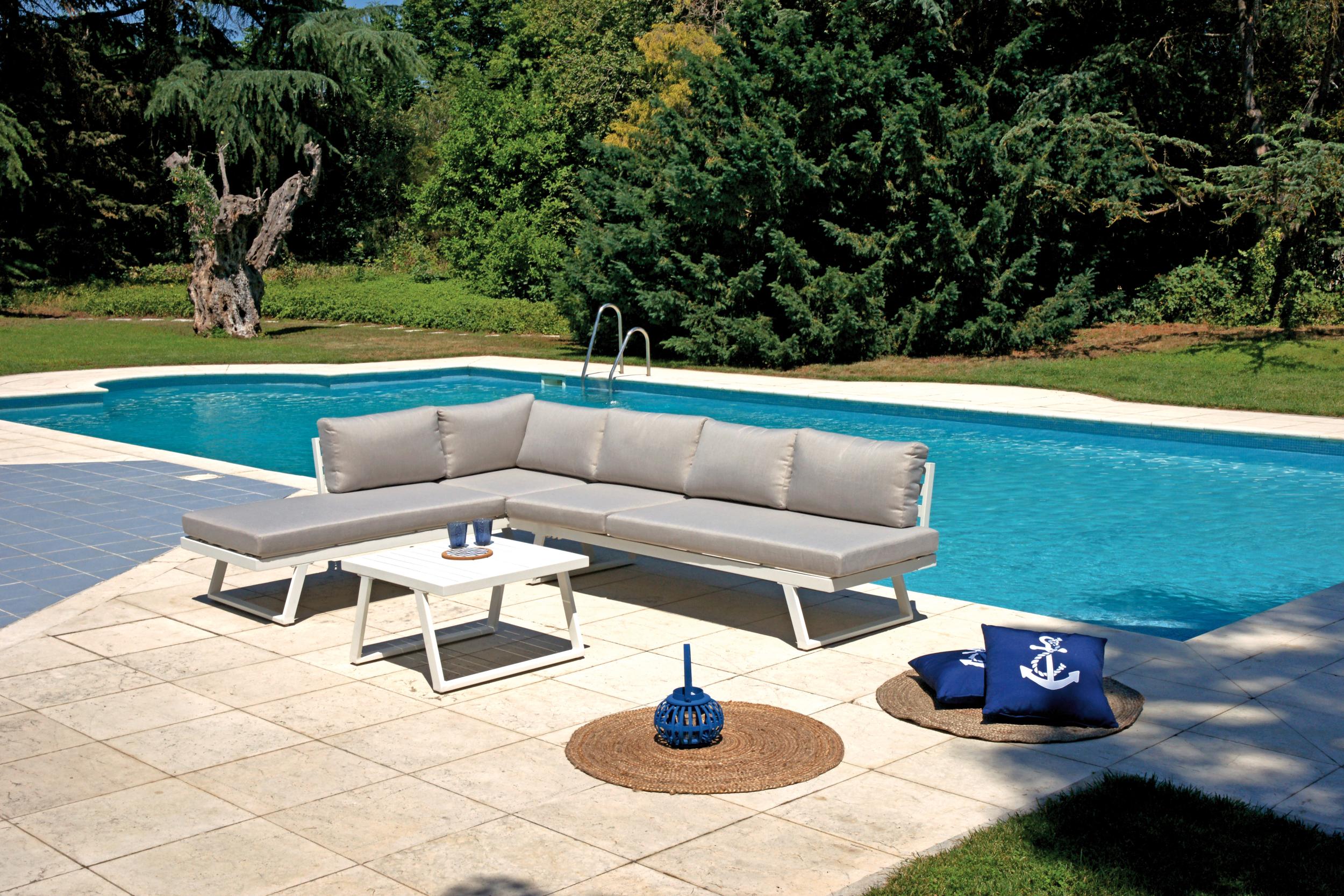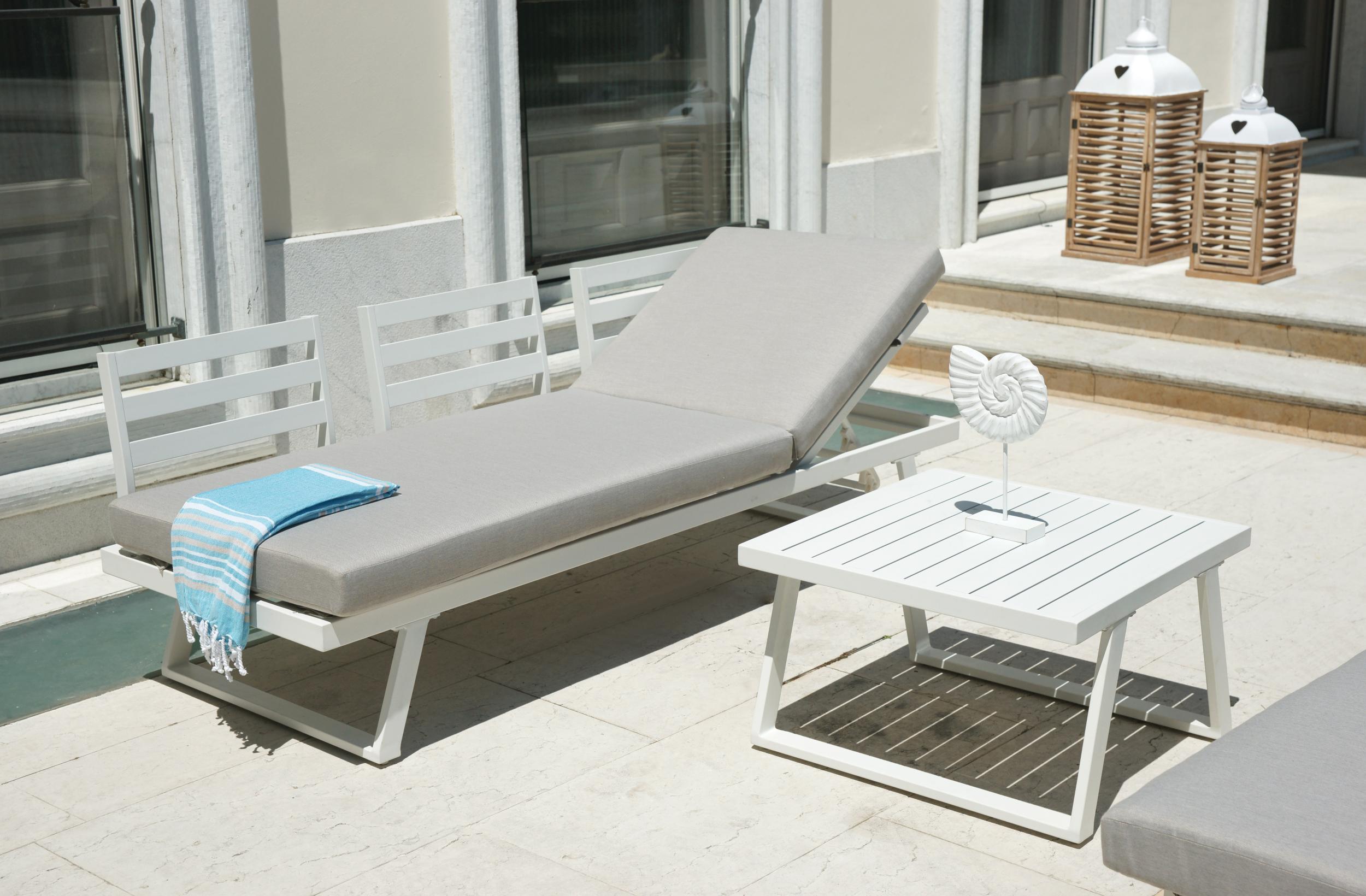 Composto da 2 divani a 3 posti trasformabili in lettini, tavolino 68 x 68 x 41 cm con piano a doghe di alluminio, struttura in alluminio BIANCO, cuscini sfoderabili sabbia.