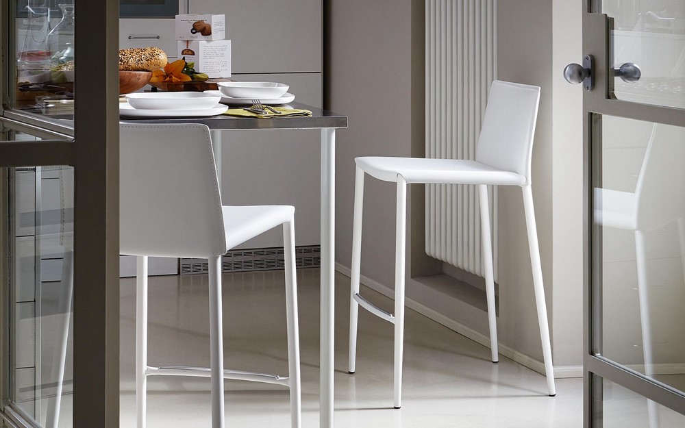 Sgabello Boheme CB1393 di Connubia. Struttura in metallo con poggiapiedi e sedile schienale rivestiti in cuoio rigenerato. Sedile e schienale sono rivestiti in cuoio rigenerato - un materiale composto da pelle e altre fibre naturali e rifinito come il cuoio - mentre le gambe a sezione conica sono in tubolare di acciaio. La cura progettuale delle linee si denota anche nella coerenza cromatica tra la struttura e la seduta sagomata. Le cuciture a vista impreziosiscono ulteriormente lo sgabello. Lo consigliamo per completare la penisola in cucina oppure in un lounge bar. Scegli la configurazione che preferisci.