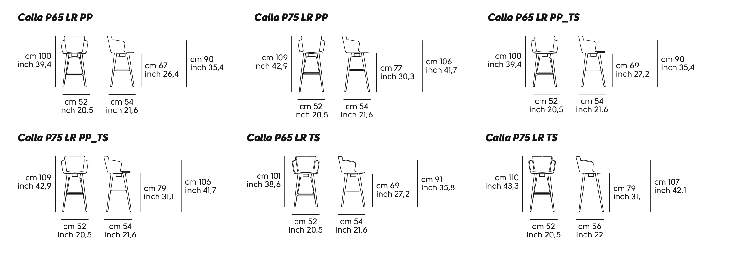 Sgabello Calla S/P LR con base in legno e scocca in polipropilene o imbottita.