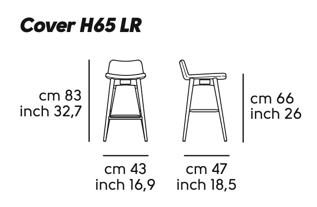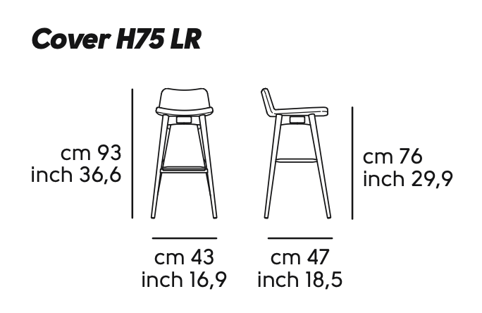 Sgabello Cover con base in legno di frassino tinto. Sedile rivestito in tessuto, pelle o similpelle.
