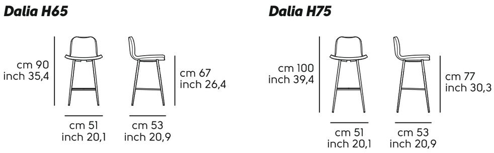 Disponibile in due altezze per la seduta: 65 cm (consigliato per penisole cucina) o 75 cm (consigliato per una altezza bancone bar).
