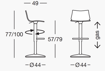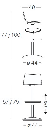 Sgabello girevole regolabile in altezza con pistone a gas. Base e colonna in acciaio cromato. Sedile imbottito con anima in policarbonato. Per uso interno.